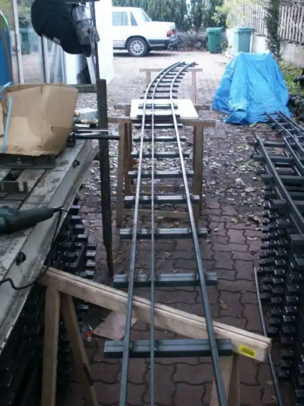 Les 2 files de rails 7¼ pouces sont réalisées en fer plat de 12 x 30mm, la file du 3éme rail en écartement 5pouces est en fer plat de 8 x 30mm, les traverses en fer U de 40mm, le tout soudé au poste automatique. Pour une grande précision, les rails sont pré-cambrés à la cintreuse, ce qui donne une courbe parfaitement uniforme, et montés sur un marbre dans un gabarit réalisé à la fraiseuse. L’assemblage entre rail se fait par des éclisses soudées sur un des rail, et boulonné sur l’autre. Poids de chaque rail 35kg environ, poids d’une aiguille 80kg environ.Total 63 éléments 2200kg.
